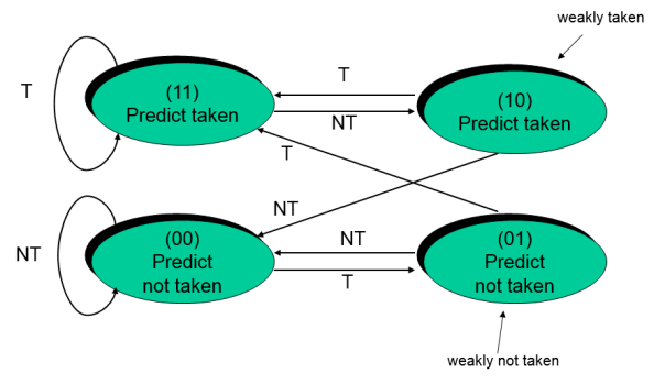 - Every time when done in the inner loop and bouncing back to the outer loop the last jump in the inner loop was “not taken” (breaking the loop) and it will always predict the next inner loop to then also be “not taken” which is often wrong.