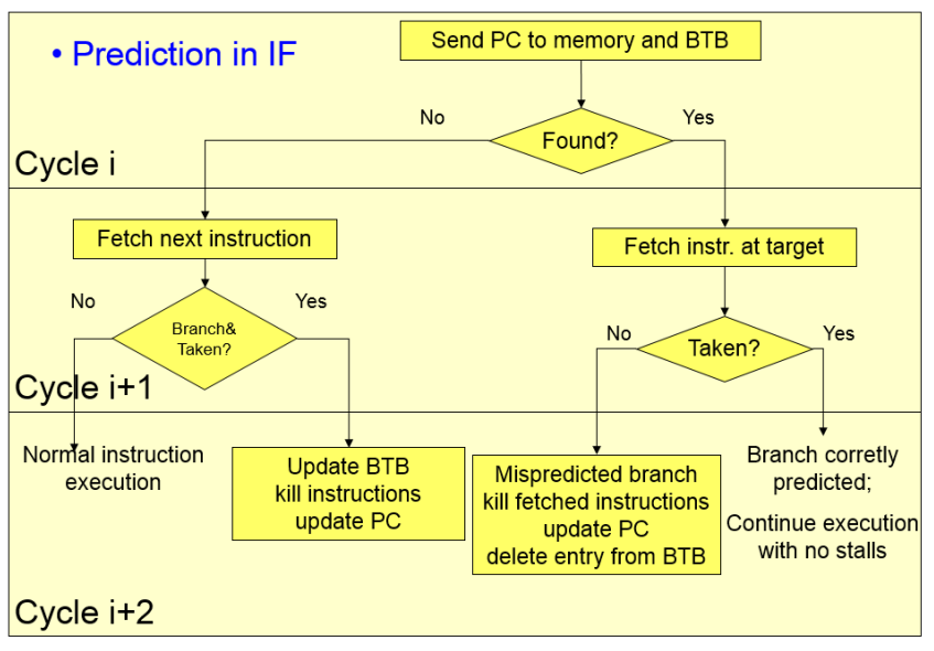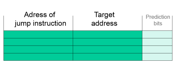 - Optionally stores prediction bits; If not then an entry in the table implies the jump. (And is only written into the table if jup was done, else it is not written / removed)