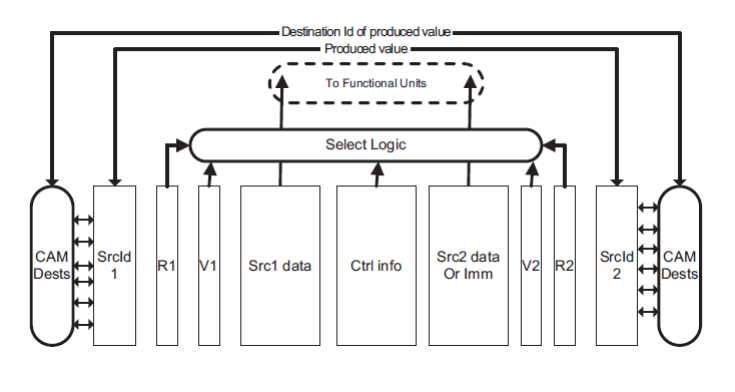 Each operation result is then propagated back through the content addressable memory (“CAM”) to look for instructions waiting for the result and filling in the missing operands