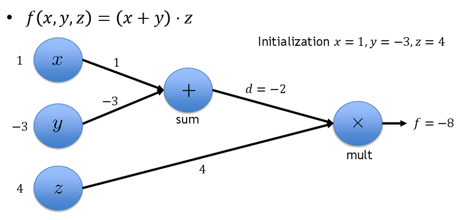 - To do this, first evaluate the loss function as described above and let each node remember it’s intermediate result.