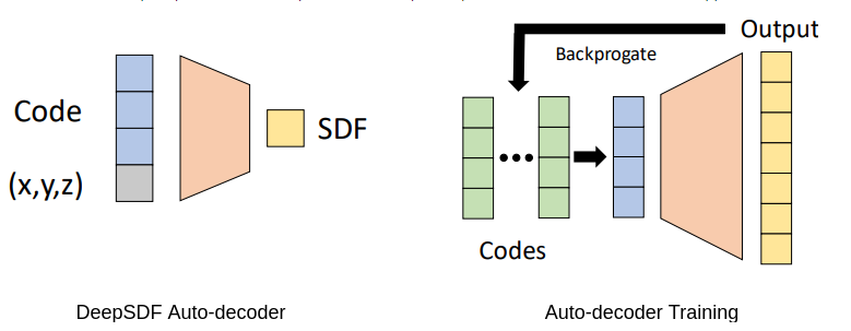 - During training, the autodecoder optimizes both the network parameters and the latent codes representing each of the training shapes. Once trained, to reconstruct a shape given its SDF observations, a latent code is optimized keeping the network parameters fixed, such that the optimized latent code gives the lowest error with observed SDF values.