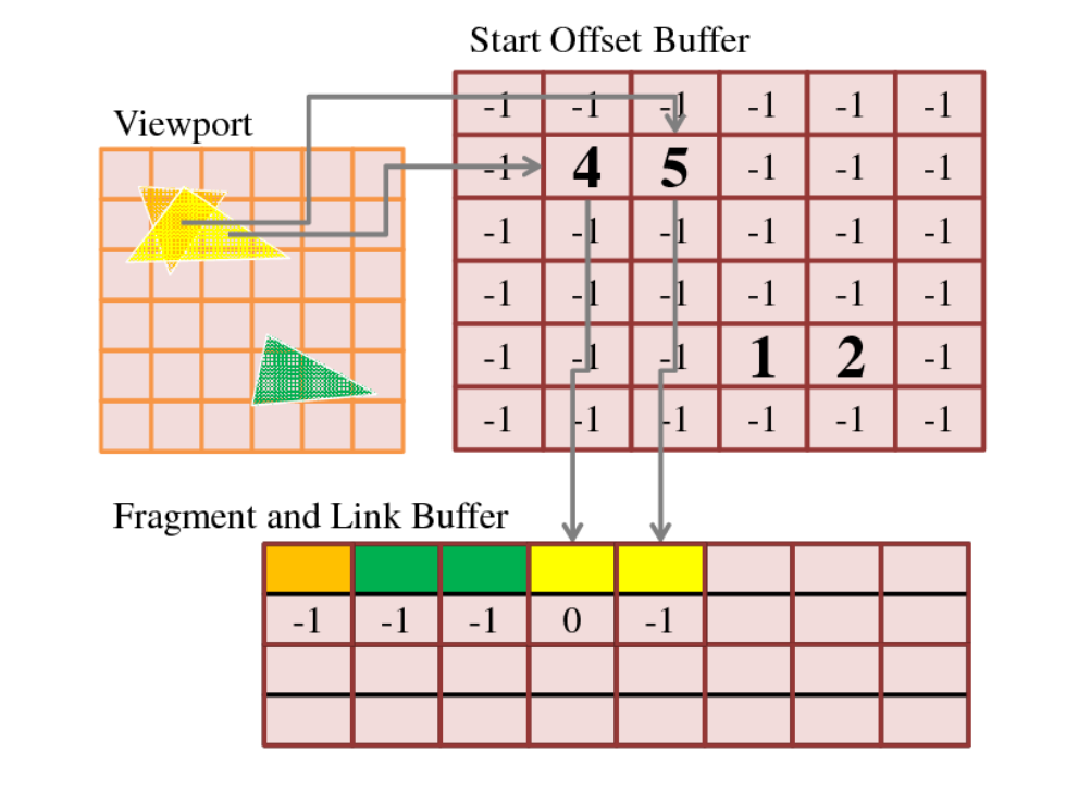 - If this fragment has still -1 in the Start Offset Buffer, discard it (as in the first render pass, it was also not hit)