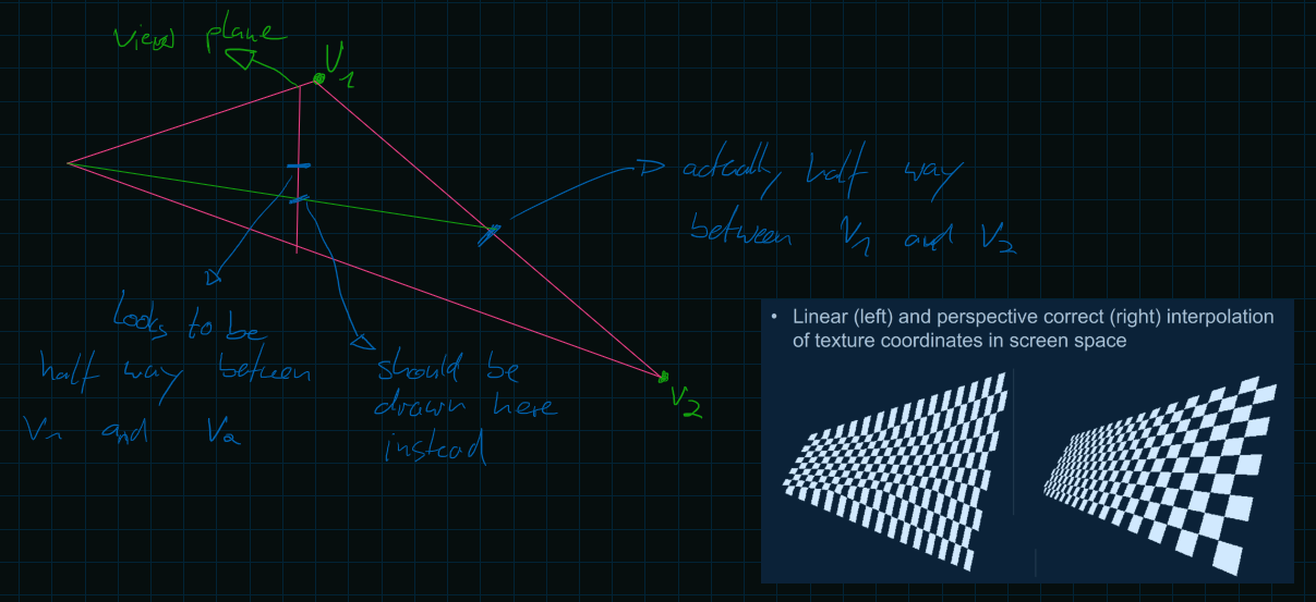 - when iterpolating an attribute, divide it by 1/w (last attribute) to get the corrected value